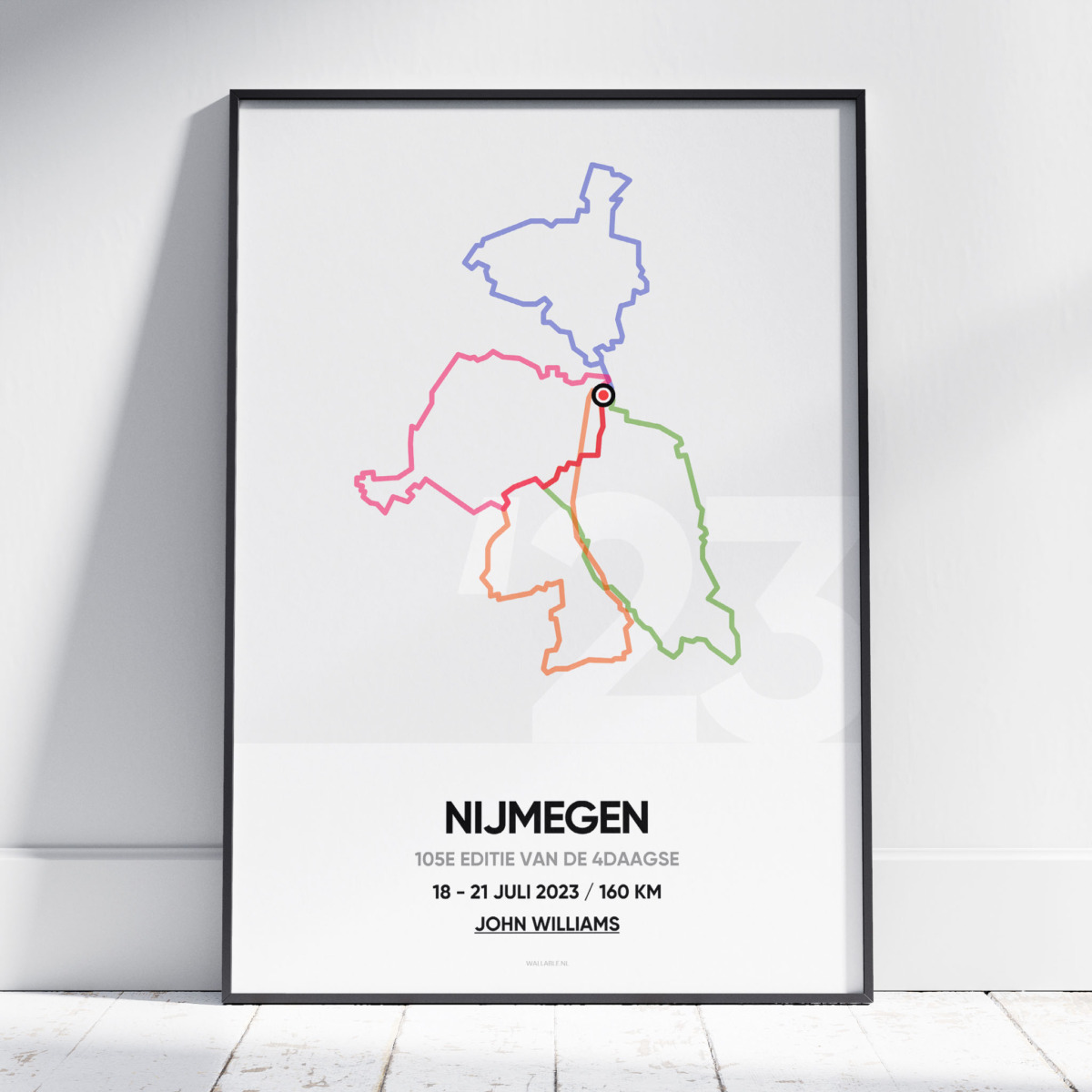 Prachtige, minimalistische poster met de route van de 4Daagse van Nijmegen 2023. Verkrijgbaar voor de vier verschillende afstanden (120KM, 160KM, 160KM Militairen en 200KM). Deze mooie sportposter dient als aandenken aan dit geweldige wandel event. Geef hem cadeau aan iemand die hem heeft gewandeld of koop hem zelf als blijvend aandenken aan de vierdaagse.