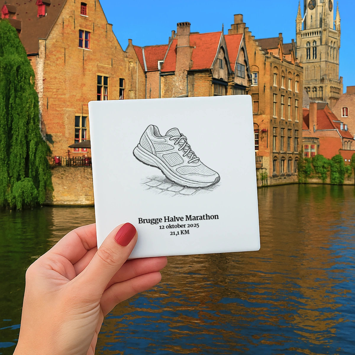 De Brugge Marathon combineert sport, sfeer en historie. Met dit tegeltje geef je die bijzondere dag een blijvende plek – een klein kunstwerk dat symbool staat voor jouw doorzettingsvermogen en trots.